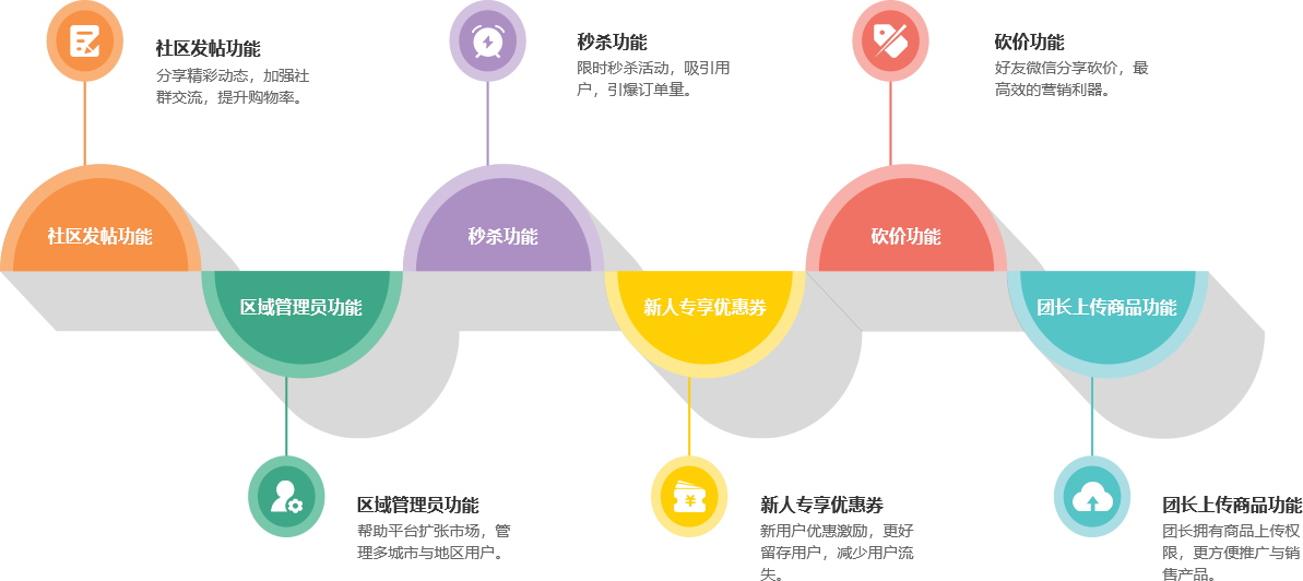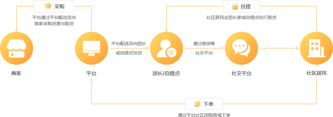 社区团购是一种全新的团购模式,平台统一提供相应产品,通过小区团长、辐射小区用户。社区用户在小程序下单后,平台可直接发货至用户,或用户至团长处自提。平台通过【预售+拼团】,拼团以销定产,降低损耗和成本、用户可得到真正的实惠。